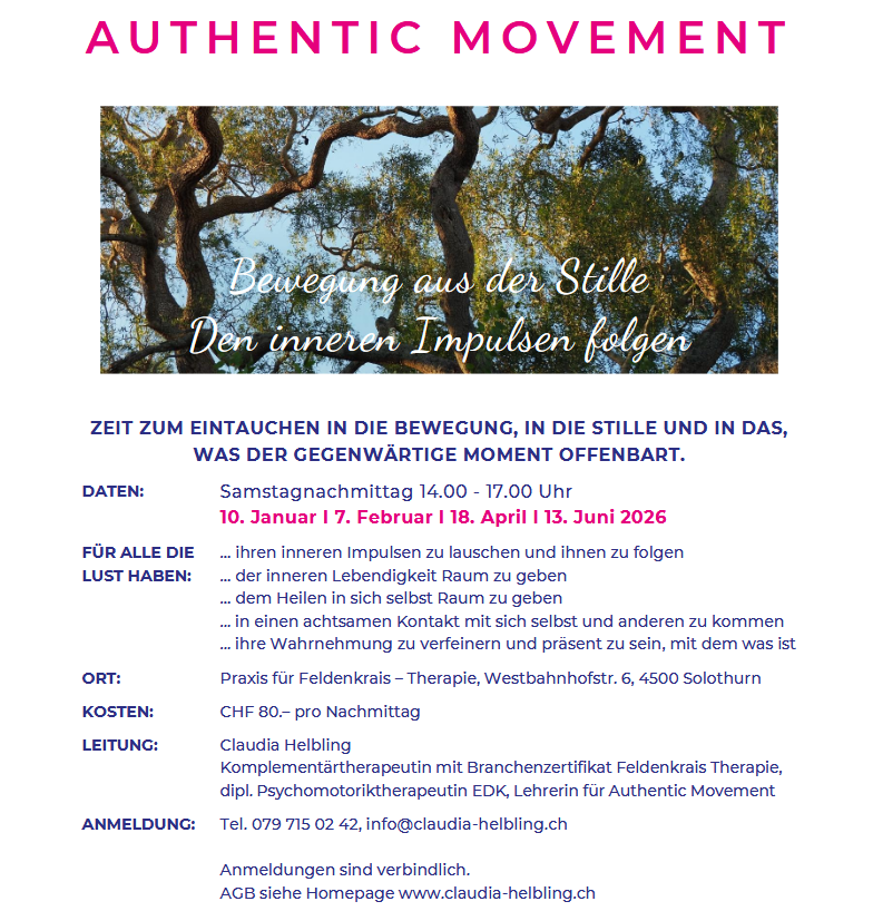 AUTHENTIC MOVEMENT SEMINARE NÄCHSTE DATEN Samstag, 10. Januar 26 Download Flyer als pdf! . HIER ANMELDEN Teilen Sie diese Nachricht! FacebookXLinkedInWhatsAppE-Mail